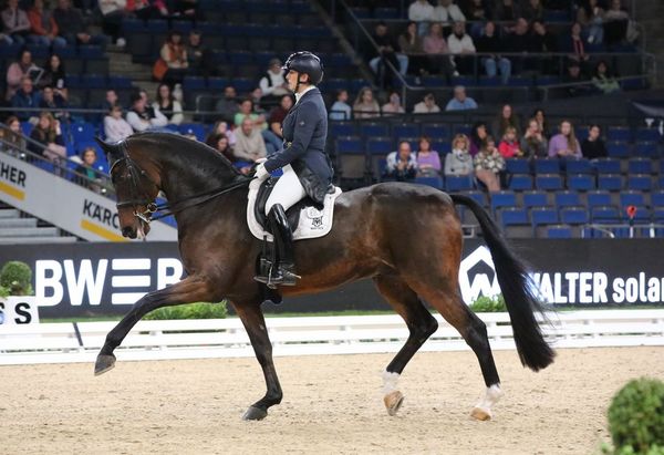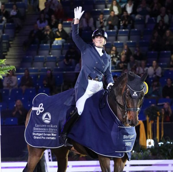 „Lokalmatadorin“ Carina Harnisch (Neuenstein), die für den RFV Öhringen startet, und ihr selbst ausgebildeter Fuchswallach DSP Sheldon Cooper kamen auf 71.435 Prozent und wurden Zweite. Die 41-Jährige hatte im Dezember vergangenen Jahres den renommierten Nachwuchspferde-Grand-Prix um den Louisdor-Preis gewonnen. Deshalb bekam sie von Dressur-Bundestrainerin Monica Theodorescu eine Startgenehmigung für die klassische Tour in der Hanns-Martin-Schleyer-Halle, wo sie 2024 sowohl in der Einlaufprüfung als auch im Finale des iWEST-Dressur-Cups siegreich geblieben war.