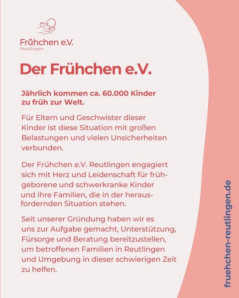 Der komplette Erlös geht an den Frühchen e.V. Reutlingen, der seit fast 30 Jahren frühgeborene und schwerkranke Kinder sowie ihre Familien begleitet – mit Beratung, Unterstützung und ganz viel Herz.