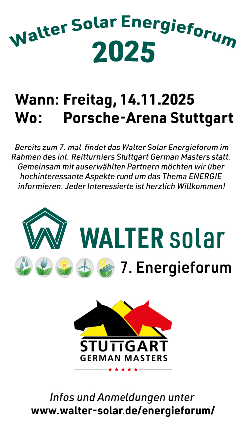 Bereits zum 7. mal findet das Walter Solar Energieforum im Rahmen des int. Reitturniers STUTTGART GERMAN MASTERS statt. Gemeinsam mit ausgewählten Partnern möchten wir über hochinteressante Aspekte rund um das Thema ENERGIE informieren. Jeder Interessierte ist herzlich Willkommen!